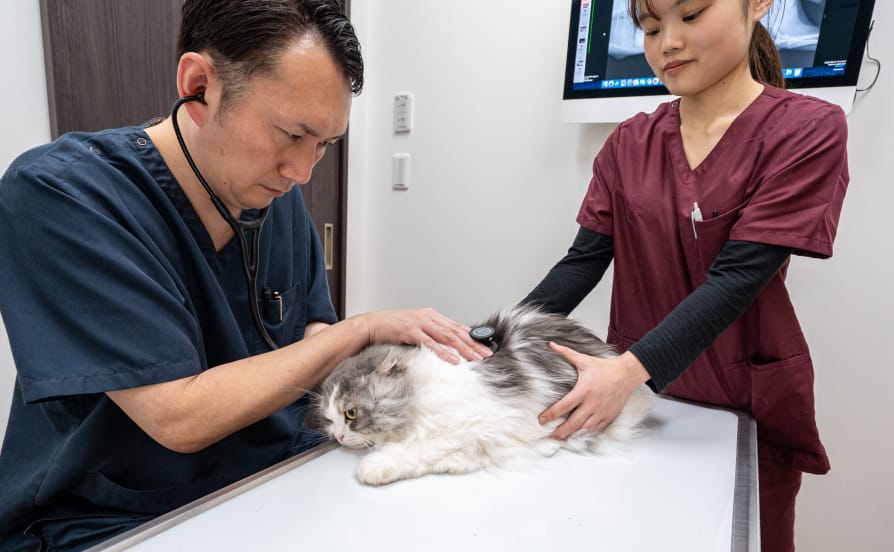 獣医師が全身状態を確認し、必要に応じて検査を行い、原因を探ります。